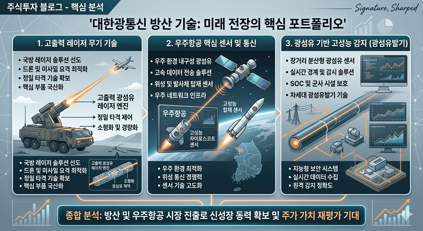 한국형 레이저 대공 무기 시스템의 핵심 기술을 보유한 대한광통신이 방산 시장을 넘어 우주항공 분야로까지 사업 영역을 확장하며 주목받고 있습니다. 특히 레이저 무기의 심장이라 할 수 있는 고출력 광섬유 레이저 분야에서 국내 유일의 수직 계열화를 완성했다는 점은 K-방산의 자립도를 한층 높이는 성과로 평가됩니다. 이번 글에서는 대한광통신이 보유한 핵심 기술력과 향후 성장 가능성을 심층 분석해 보겠습니다.