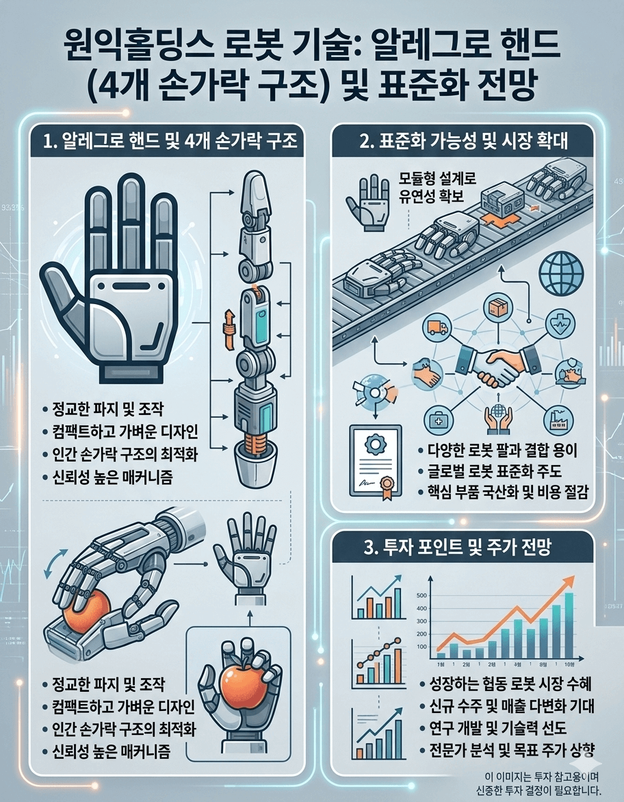 원익홀딩스의 '알레그로 핸드'는 비용 효율성과 인간 수준의 조작 능력을 겸비한 4개 손가락 구조로 로봇 손 분야의 혁신을 이끌고 있습니다. 16개 관절의 독립 구동이라는 기술적 우위와 함께, 향후 산업 표준으로 자리 잡을 가능성이 높다는 점에서 주목할 만합니다. 로봇 손 제조의 높은 기술적 난이도를 고려할 때, 이를 정복한 기업은 모듈형 로봇 생태계에서 핵심적 위치를 차지할 것으로 예상됩니다. 최근 섹터 조정은 장기 투자자에게 기회가 될 수 있습니다.